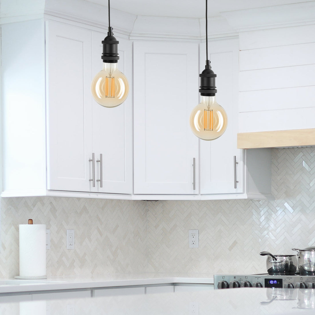 The Andy Suspension Kit from Brilliant can be used with just a decorative globe or you can add a shade. The Andy also has adjustable cord lengths to suit different ceiling heights.