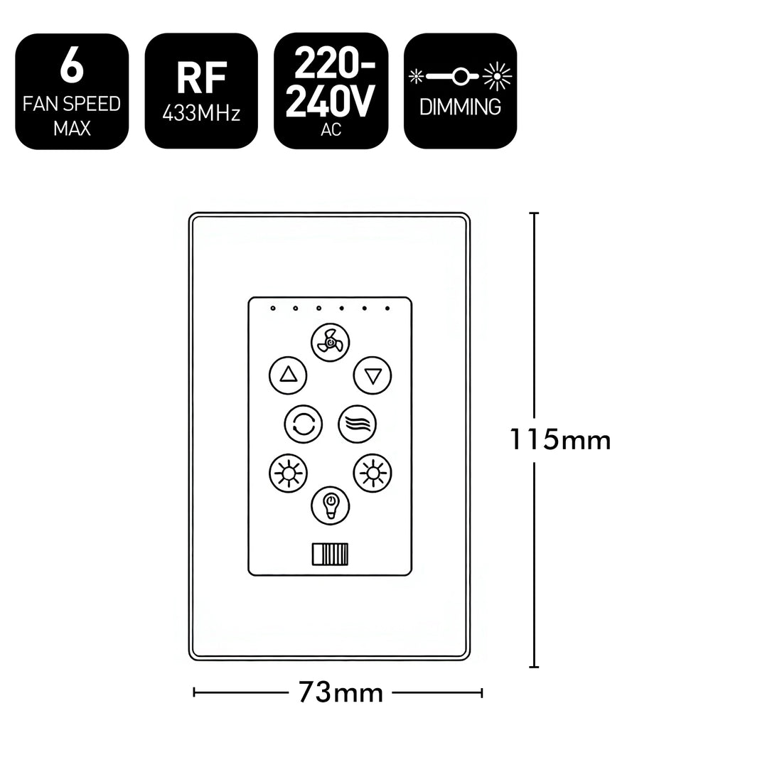 Modern wall controller suitable for Cairns DC, Fantastic 60', Costa, Vector DC, Fantastic 52', Amari SII, and Solana DC range. This controller is designed to fit into most wall switch holes (using a C-clip bracket), without any additional cutout required.