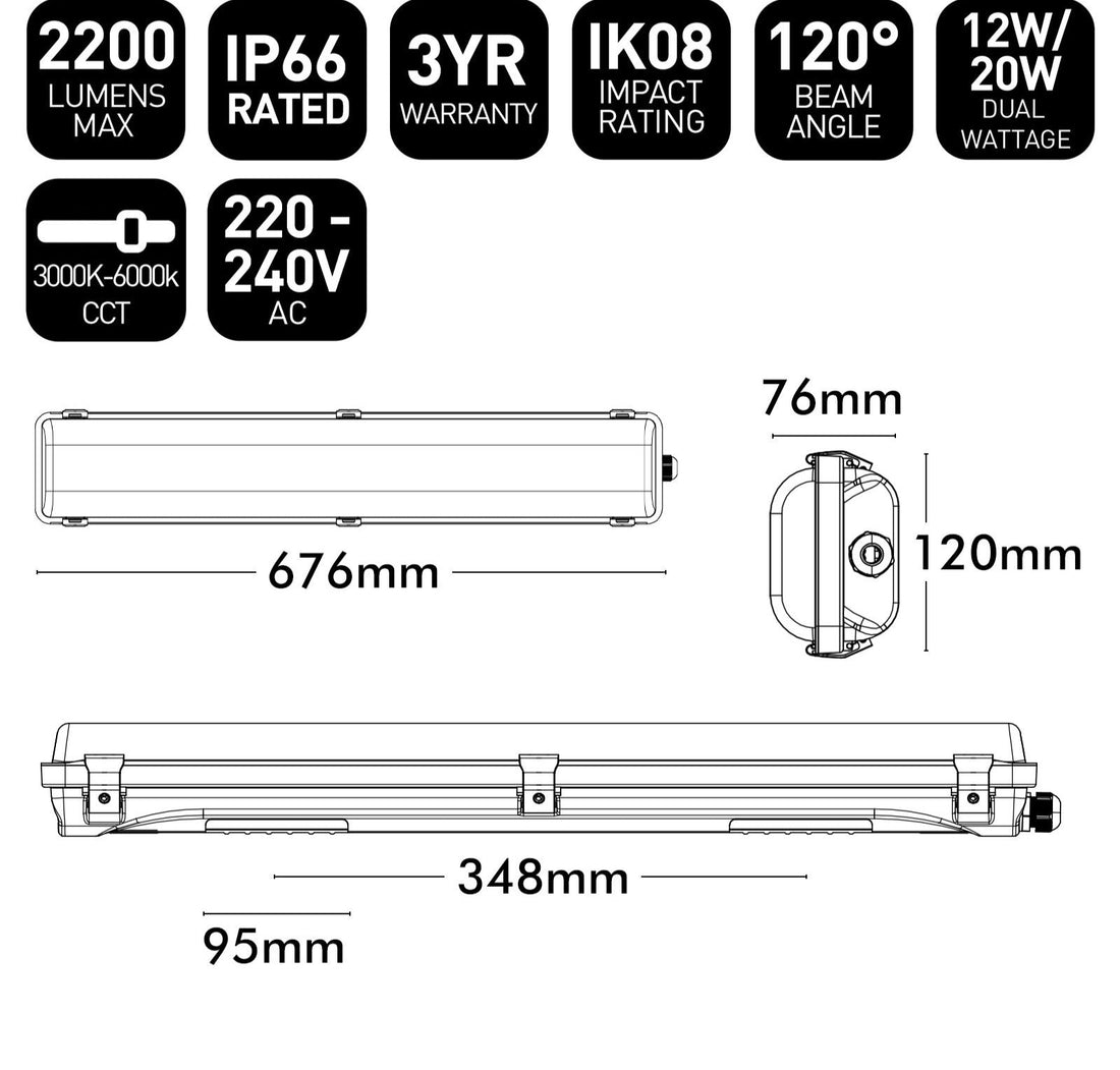 The White Endura 12W/20W CCT LED Tri-Proof Emergency Batten is a durable, waterproof, dustproof, and corrosion-resistant lighting solution with selectable colour temperatures, ideal for commercial and industrial environments.