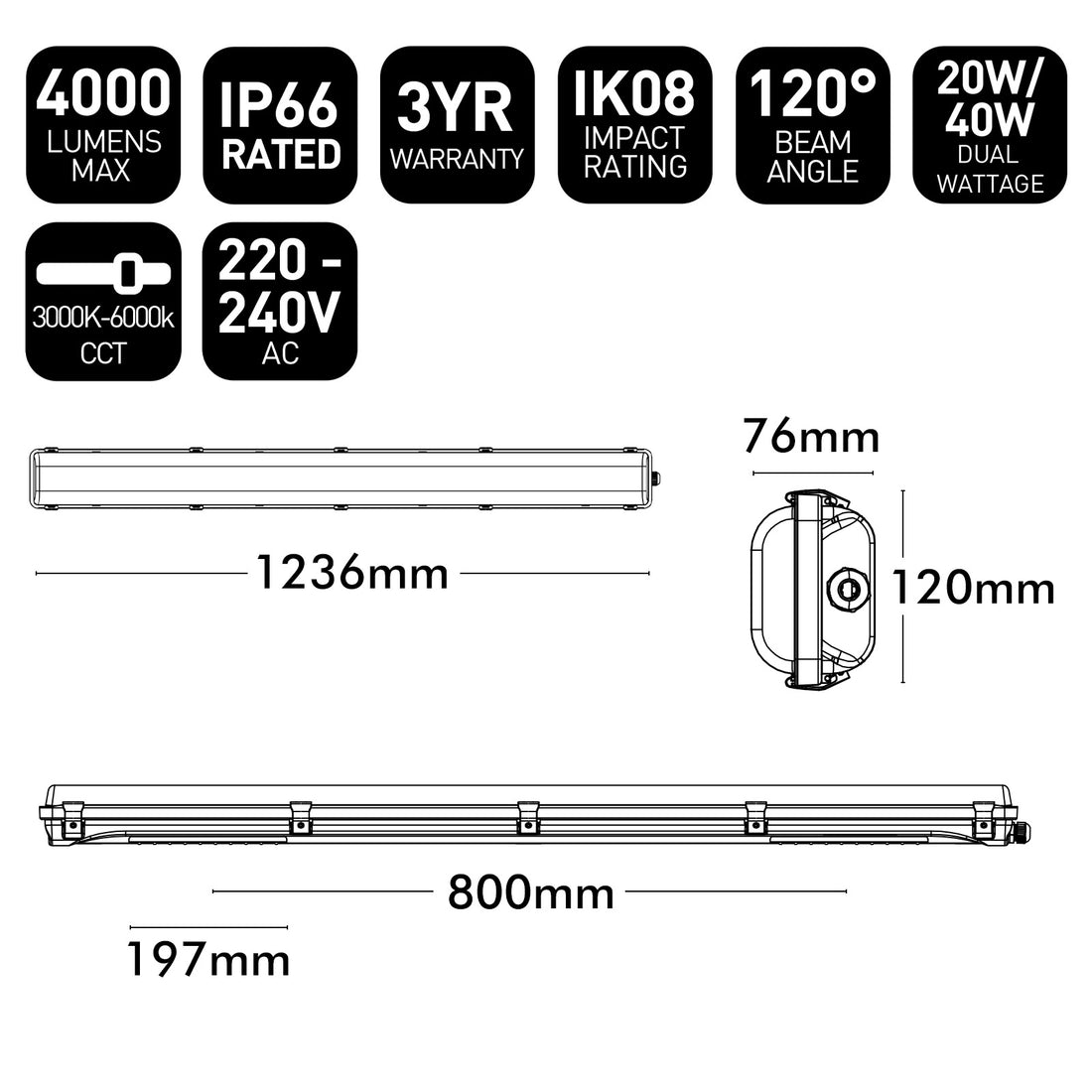 Brilliant White Endura 22W/40W Dual-Wattage LED Tri-Colour Batten with Corridor function and Microwave Sensor