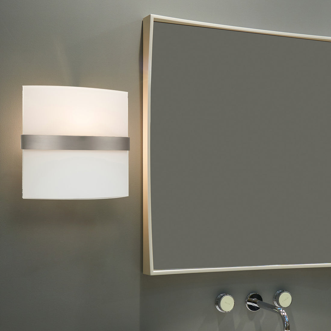 Contemporary wall light designed in glass shade with satin nickel band detail, nice decorative piece for your home.