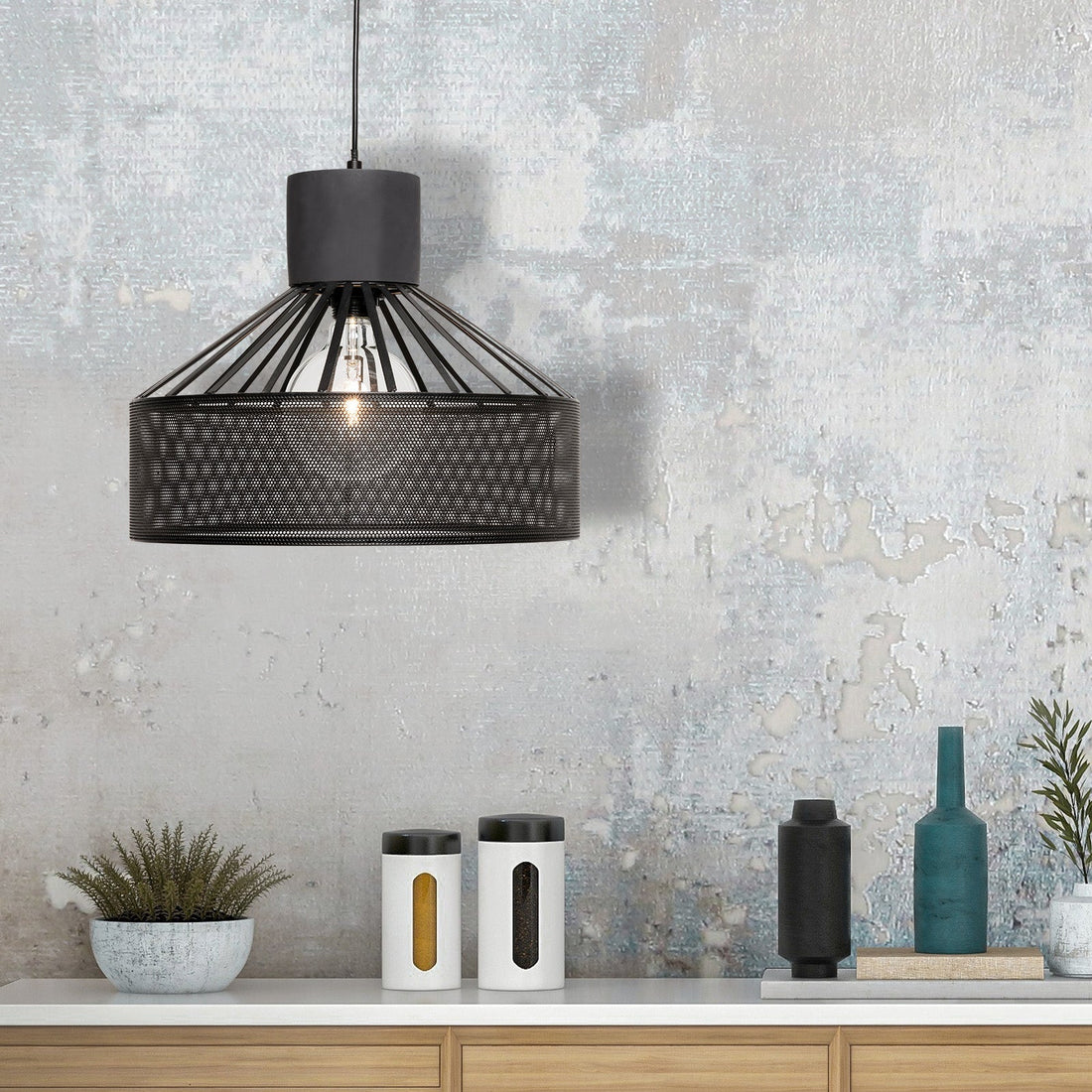 The Slater Mesh and Concrete Pendant is suitable for modern and industrial households, with its perforated black metal finish and concrete detail. We recommend the Brilliant Soft Opal or Flexi Amber globe range for best effect.